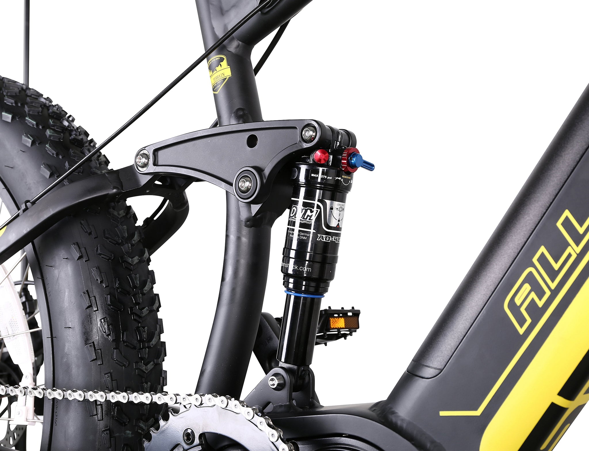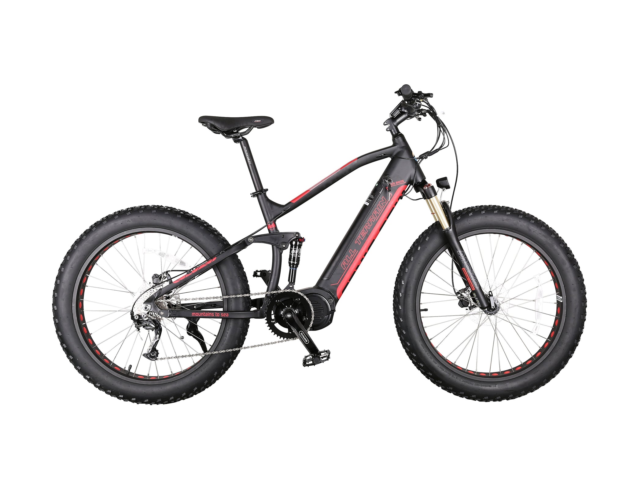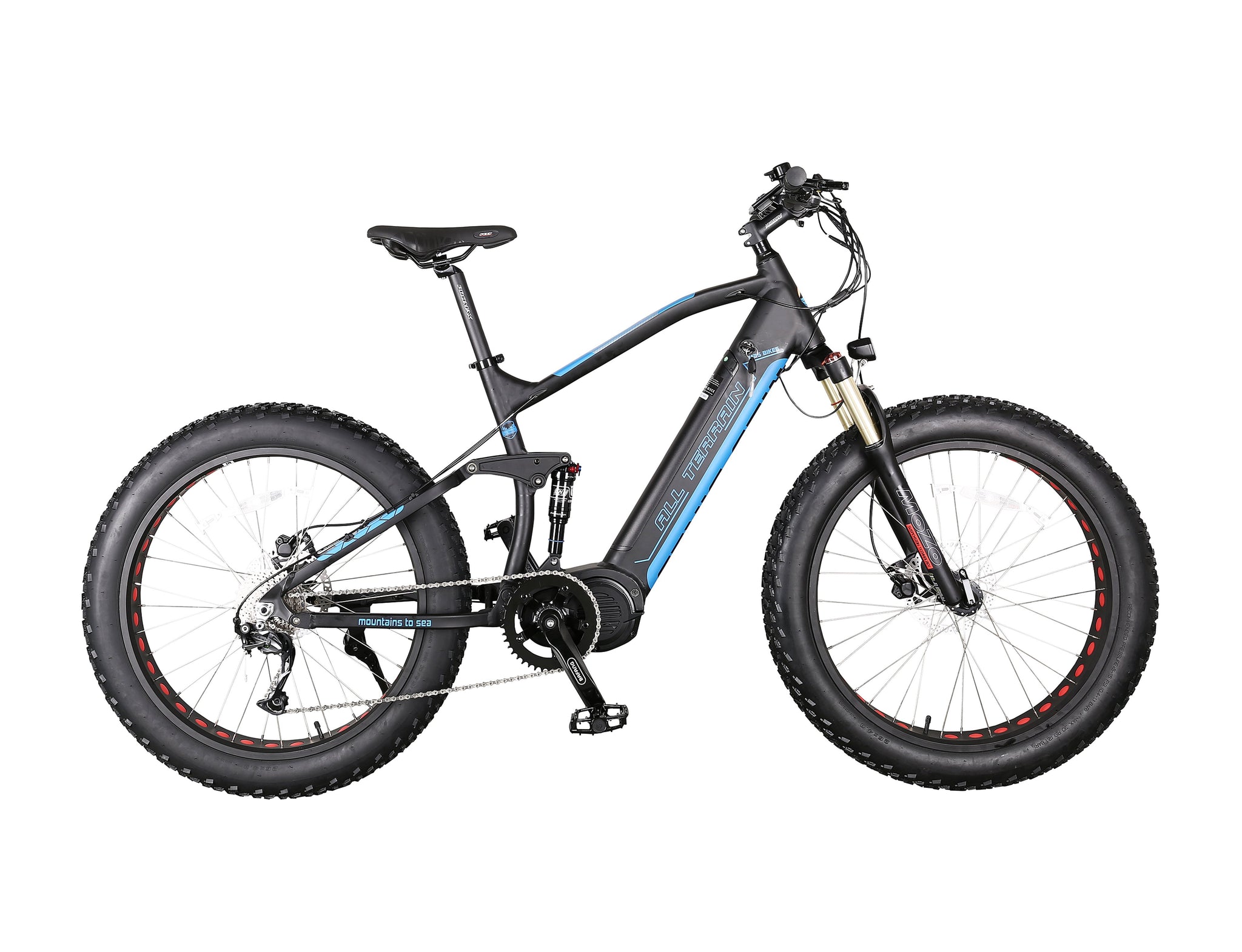 The M2S Bikes | Mountains To Sea Electric Bikes All Terrain Ultra is one of the most powerful electric fat bikes on the market. The new Bafang Ultra Max motor provides up to 1500 watts of power to help riders conquer the steepest hills while enjoying a comfortable ride thanks to the 4" fat tires that offer incredible traction and a soft ride on all types of terrain. The full suspension fat bike design provides riders with a combination of massive power, fast top speed and a durable frame to make this the ultimate fat bike that's ready to take on the most rugged off road terrain while still being king of the city streets thanks to the high speed powerful motor. The All Terrain Ultra features the new Mozo Air Suspension Fork and DNM rear shock with lockout, 9-speed Shimano Alivio gearset and a 48v, 14.5 amp hour integrated battery powered by Panasonic cells. Stopping is fast and easy thanks to the mm Tektro Auriga hydraulic disc brakes.