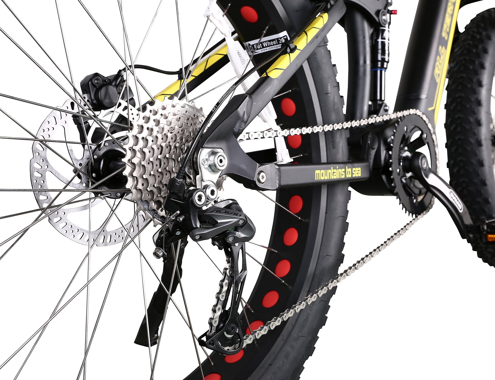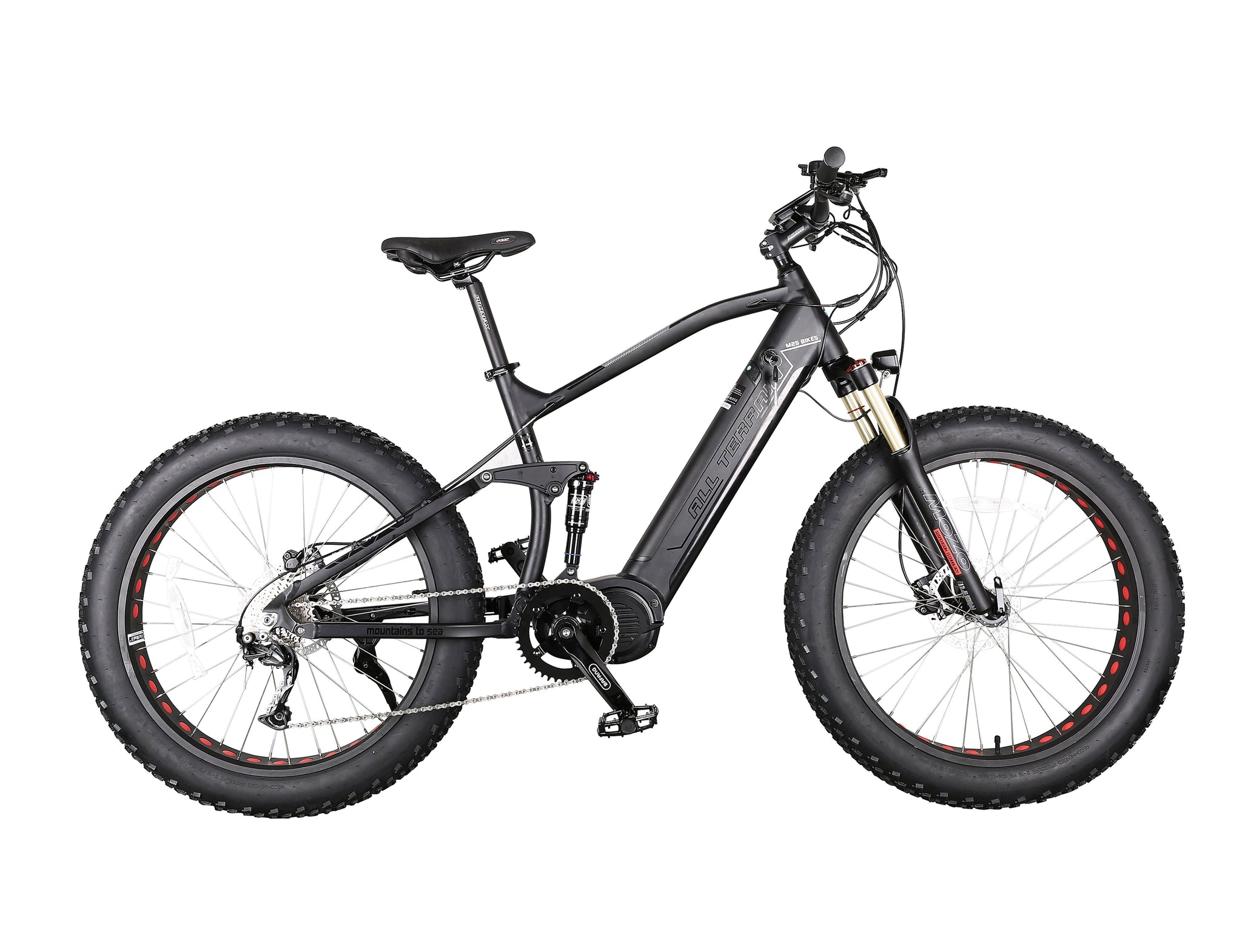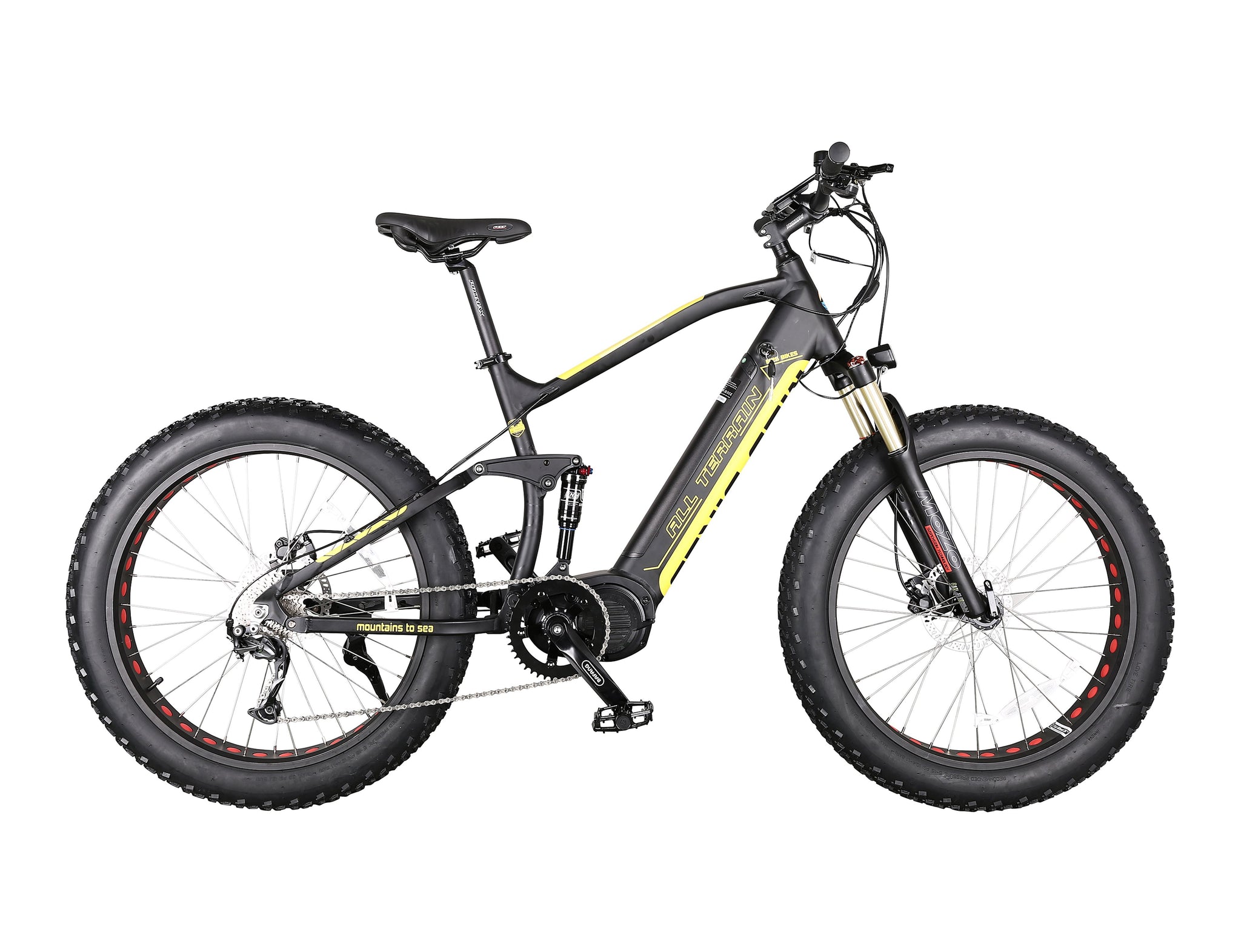 The M2S Bikes | Mountains To Sea Electric Bikes All Terrain Ultra is one of the most powerful electric fat bikes on the market. The new Bafang Ultra Max motor provides up to 1500 watts of power to help riders conquer the steepest hills while enjoying a comfortable ride thanks to the 4" fat tires that offer incredible traction and a soft ride on all types of terrain. The full suspension fat bike design provides riders with a combination of massive power, fast top speed and a durable frame to make this the ultimate fat bike that's ready to take on the most rugged off road terrain while still being king of the city streets thanks to the high speed powerful motor. The All Terrain Ultra features the new Mozo Air Suspension Fork and DNM rear shock with lockout, 9-speed Shimano Alivio gearset and a 48v, 14.5 amp hour integrated battery powered by Panasonic cells. Stopping is fast and easy thanks to the mm Tektro Auriga hydraulic disc brakes.